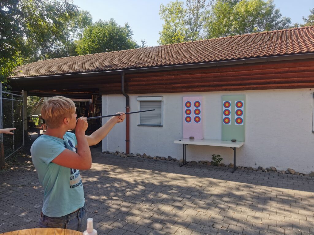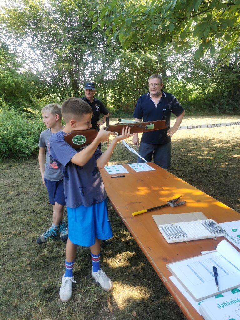 Betreut von 10 Jugendleitern und freiwilligen Helfern hieß es für die Jugendlichen dann die sechs Stationen zu bewältigen. Die Stationen waren dabei alle sehr unterschiedlich und um sie gut bewältigen zu können, brauchte man Geschick, Treffsicherheit und Koordination. Neben den Dauerbrennern Biathlon- und Armbrustschießen, gab es auch in diesem Jahr einige neue Stationen. So zum Beispiel das Team-Ski-Rennen, bei dem alle Teammitglieder auf Holzskier geschnallt möglichst schnell eine gewisse Distanz absolvieren mussten oder das derzeitig im Trend liegende Blasrohrschießen. Neben Konzentration beim akustischen Schießen, mussten die Mannschaften auch noch Teamfähigkeit beim Aufstellen eines Holzturms zeigen.